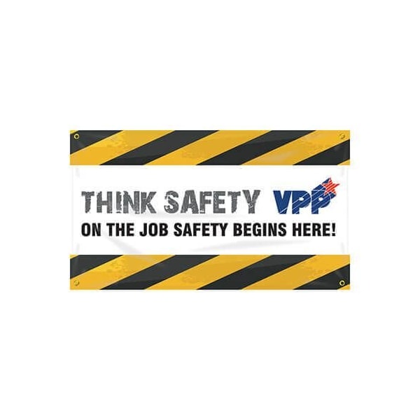 Accuform VPP Safety Banner, Legend THINK SAFETY ON THE JOB SAFETY BEGINS HERE, 10 oz Reinforced Vinyl, 28 in Height, 48 in WidthVPP motivational banners your site is VPP Promote it now that you have met the criteria for a managed safety and health system, tell everyone about it encourage continued employee and management involvement as your partnership in the voluntary protection program VPP grows Huge banners are printed on tough, durable reinforced flexible poly sheeting with double stitched hems ideal for long life indoors, yet durable enough for outdoors Metal grommets surround the banner for mounting and hanging