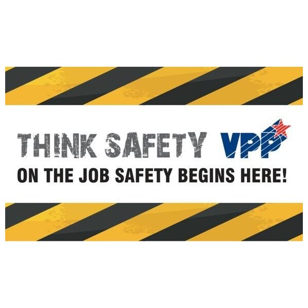 Accuform VPP Safety Banner, Legend THINK SAFETY ON THE JOB SAFETY BEGINS HERE, Reinforced Flexible Poly Sheeting, 28 in Height, 96 in WidthVPP motivational banners your site is VPP Promote it now that you have met the criteria for a managed safety and health system, tell everyone about it encourage continued employee and management involvement as your partnership in the voluntary protection program VPP grows Huge banners are printed on tough, durable reinforced flexible poly sheeting with double stitched hems ideal for long life indoors, yet durable enough for outdoors Metal grommets surround the banner for mounting and hanging