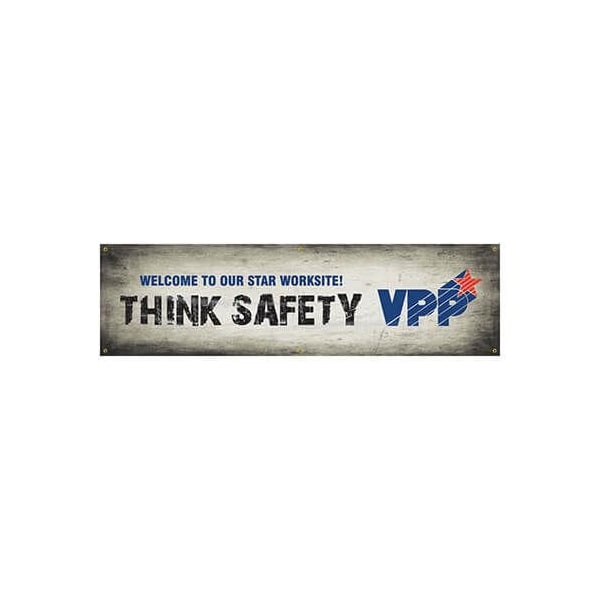 Accuform VPP Safety Banner, Legend WELCOME TO OUR STAR WORKSITE THINK SAFETY, Reinforced Flexible Poly Sheeting, 28 in Height, 96 in WidthVPP motivational banners your site is VPP Promote it now that you have met the criteria for a managed safety and health system, tell everyone about it encourage continued employee and management involvement as your partnership in the voluntary protection program VPP grows Huge banners are printed on tough, durable reinforced flexible poly sheeting with double stitched hems ideal for long life indoors, yet durable enough for outdoors Metal grommets surround the banner for mounting and hanging