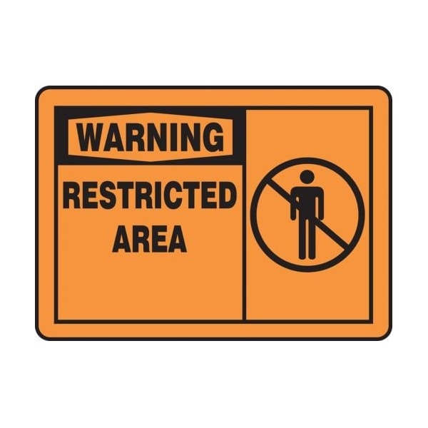 Accuform Warning Sign, WARNING Header, TextSymbol Legend, RESTRICTED AREA GRAPHIC Legend, 0055 in Plastic, Hole Mount, 10 in Height, 14 in Width, Black on White SignBlack on Orange HeaderSafety Signs identify and indicate potential, type and degree of hazards that may lead to accidental injury or property damage Plastic signs are semiflexible, made with 50 recycled content and ideal for indoor and shortterm, sheltered outdoor environments Plastic signs feature good impact resistance, UV inhibitors and enough flex to mount on slightly curved areas