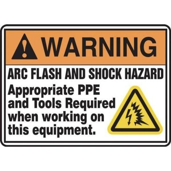 Accuform Warning Sign, WARNING Header, TextSymbol Legend, ARC FLASH AND SHOCK HAZARD APPROPRIATE PPE AND TOOLS REQUIRED WHEN WORKING ON THIS EQUIPMENT Legend, 004 in Aluminum, 10 in Height, 14 in Width