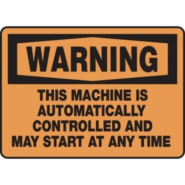 Accuform Warning Sign, Header WARNING, Text Legend, Legend THIS MACHINE STARTS AUTOMATICALLY, 6 mil Adhesive DuraVinyl, 7 in Height, 10 in WidthSafety Signs identify and indicate potential, type and degree of hazards that may lead to accidental injury or property damage Duallayered Adhesive DuraVinyl delivers exceptional flexibility and performance, outperforming standard vinyl Printed image is protected by a highgloss UV protective coating Adhesive DuraVinyl is durable, even in the toughest indoor and outdoor conditions and adheres to most smooth, curved and irregular surfaces