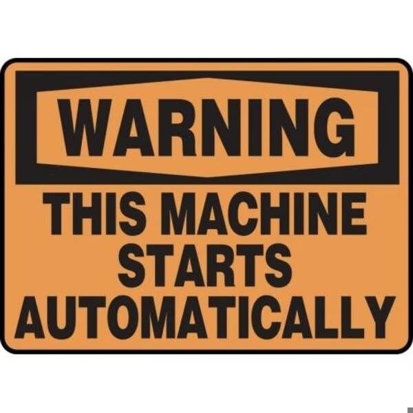Accuform Warning Sign, Header WARNING, Text Legend, Legend THIS MACHINE STARTS AUTOMATICALLY, 6 mil Adhesive DuraVinyl, 10 in Height, 14 in WidthSafety Signs identify and indicate potential, type and degree of hazards that may lead to accidental injury or property damage Duallayered Adhesive DuraVinyl delivers exceptional flexibility and performance, outperforming standard vinyl Printed image is protected by a highgloss UV protective coating Adhesive DuraVinyl is durable, even in the toughest indoor and outdoor conditions and adheres to most smooth, curved and irregular surfaces