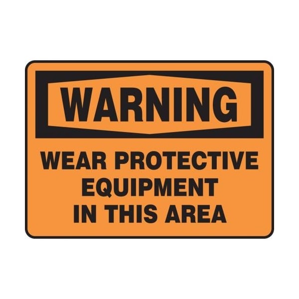 Accuform Warning Sign, Header WARNING, Text Legend, Legend WEAR PROTECTIVE EQUIPMENT IN THIS AREA, 0055 in Plastic, 10 in Height, 14 in Width, Black on Orange LegendBackgroundSafety Signs identify and indicate potential, type and degree of hazards that may lead to accidental injury or property damage Plastic signs are semiflexible, made with 50 recycled content and ideal for indoor and shortterm, sheltered outdoor environments Plastic signs feature good impact resistance, UV inhibitors and enough flex to mount on slightly curved areas