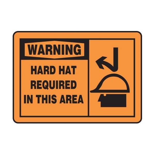 Accuform Warning Sign, WARNING Header, TextSymbol Legend, HARD HAT REQUIRED IN THIS AREA GRAPHIC Legend, 4 mil Adhesive Vinyl, Surface Mounting, 7 in Height, 10 in Width, Black on Orange LegendBackgroundSafety Signs identify and indicate potential, type and degree of hazards that may lead to accidental injury or property damage Adhesive Vinyl is the ideal choice for a variety of indoor and sheltered outdoor, marking needs Easily mounts to all curved areas such as pipes, poles and secondary containers Adhesive Vinyl signs feature a printed matte surface, moistureresistance and scored backing for quick peeloff and application
