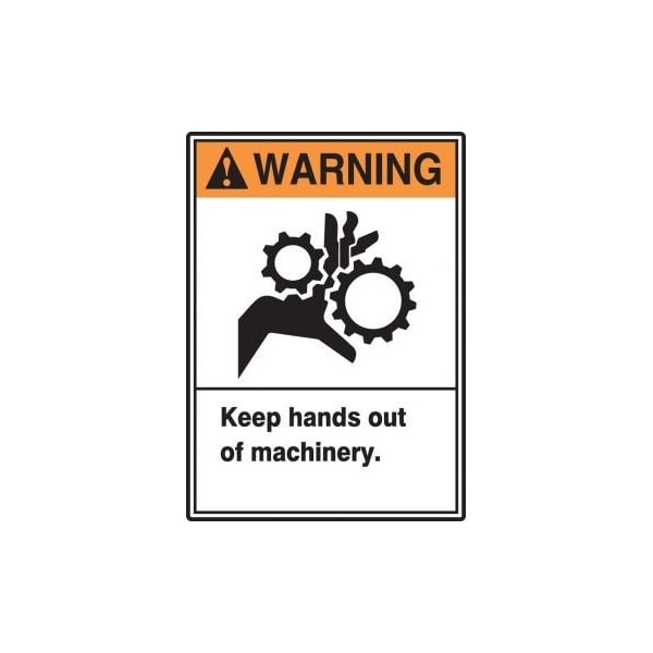 Accuform Warning Sign, WARNING Header, TextSymbol Legend, ANSI KEEP HANDS OUT OF MACHINERY GRAPHIC Legend, 0055 in Plastic, 10 in Height, 7 in Width, BlackOrange on white LegendBackgroundSafety Signs identify and indicate potential, type and degree of hazards that may lead to accidental injury or property damage Plastic signs are semiflexible, made with 50 recycled content and ideal for indoor and shortterm, sheltered outdoor environments Plastic signs feature good impact resistance, UV inhibitors and enough flex to mount on slightly curved areas