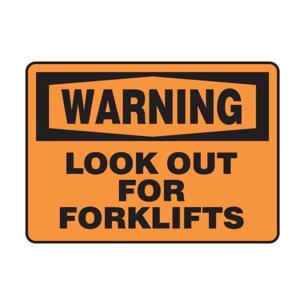 Accuform Warning Sign, Header WARNING, Text Legend, Legend LOOK OUT FOR FORKLIFTS, 0055 in Plastic, 10 in Height, 14 in Width, Black on Orange LegendBackgroundSafety Signs identify and indicate potential, type and degree of hazards that may lead to accidental injury or property damage Plastic signs are semiflexible, made with 50 recycled content and ideal for indoor and shortterm, sheltered outdoor environments Plastic signs feature good impact resistance, UV inhibitors and enough flex to mount on slightly curved areas