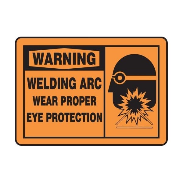 Accuform Warning Sign, WARNING Header, TextSymbol Legend, WELDING ARC WEAR PROPER EYE PROTECTION Legend, 004 in Aluminum, 7 in Height, 10 in Width, Black on Orange LegendBackgroundSafety Signs identify and indicate potential, type and degree of hazards that may lead to accidental injury or property damage Aluminum signs withstand washdowns, harsh elements, abusive conditions and feature good chemical, abrasion and impact resistance Aluminum is excellent for indoor and outdoor usage, making it ideal for a wide variety of industrialstrength applications
