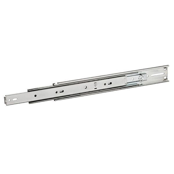 Drawer Slide, Closure Type Non-Self-Closing, Mounting Type Bracket, Glide Mechanism Ball Bearings, Finish Zinc Plated, Extension Type Over-Travel, Disconnect Method Lever, Closed Length 24 in, Travel Length 26 in, Side Mount Load Cap. per Pair 115 lb, Load Capacity 115 lb, Side Space 0.38 +/-0.030 in, Extended Length 50 in, Over Travel Distance 2 in, Detent Type Lock-Out, Material Steel, Silver, Package Quantity 2