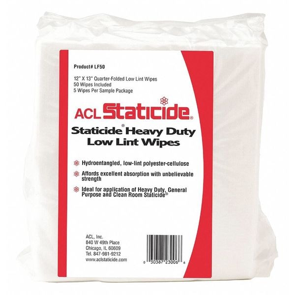 Dry Wipe, Wipe Type Cleanroom Wipe, 1/4 Fold, Product Series Staticide(R), White, Minimum Cleanroom Standards ISO 6 (Class 1000), Hydro-Entangled (HEF), Lint Level Low Lint, Roll Length No Roll, Sheet Length 13 in, Sheet Width 12 in, Number of Sheets 50