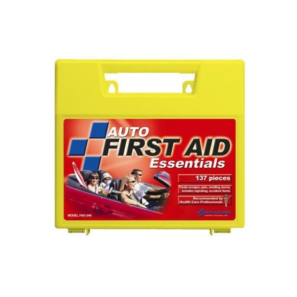 137 Piece Auto First Aid Kit Comprehensive Preparedness Specifically Designed For Automobile Travel AMA First Aid Guide Accident Report Form Call Police Banner Vinyl Gloves Wide Array Of Bandages Trauma Pad Conform Gauze Compress Antiseptics Burn Relief & Paid Medications Including Motion Sickness Tablets.