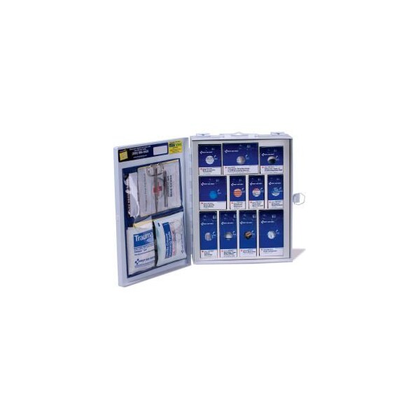 FIRST AID ONLY 90578 MEDIUM SMARTCOMPLIANCE FIRST AID KIT, ANSI COMPLIANT, CLASS A, METAL COMPACT, SOLID STEEL CASE COMES WITH A CARRYING HANDLE AND IS WALL MOUNTABLE. CONTENTS MEET THE 2015 ANSI CLASS A REQUIREMENTS AND IS SUFFICIENT TO TREAT 25 PEOPLE OR MORE. KIT CONTENTS: