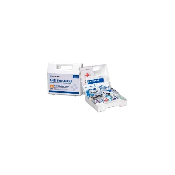 FIRST AID ONLY 90588 FIRST AID KIT, 25 PERSON, ANSI COMPLIANT, CLASS A, PLASTIC CASE PLASTIC, ORGANIZED CASE COMES WITH A CARRYING HANDLE AND IS WALL MOUNTABLE. CONTENTS MEET THE 2015 ANSI CLASS A REQUIREMENTS AND ARE SUFFICIENT TO TREAT 25 OR MORE PEOPLE. INCLUDES: