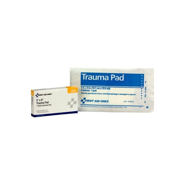 5 x 9 trauma pad with 1 per box. The sterile trauma dressing helps to stop bleeding associated with deep lacerations, abrasions, cuts and fractures. The trauma pad is an absorbent dressing with a moisture resistant barrier component. Individual single use packets are easy and convenient to use, preventing cross contamination.