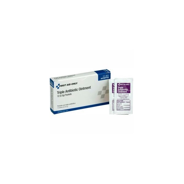 FIRST AID ONLY, TRIPLE ANTIBIOTIC OINTMENT, 12/BOX, 12-001 CONTAINS 12 FIRST AID ANTIBIOTIC OINTMENT PACKETS TO HELP PREVENT INFECTION IN MINOR CUTS, SCRAPES AND BURNS. ONE TIME USE ANTIBIOTIC OINTMENT PACKETS. ACTIVE INGREDIENTS: BACITRACIN (400 UNITS), NEOMYCIN SULFATE (5 MG), AND POLYMYXIN-B SULFATE (5000 UNITS). SOLD AS BOX OF 12 PACKETS. ONE TIME USE ANTIBIOTIC OINTMENT PACKETS.