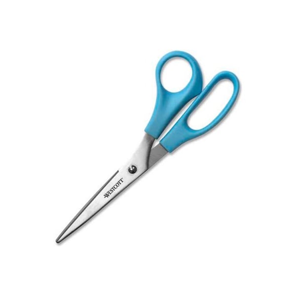 Westcott all purpose value scissors, 8"l straight, blue all-purpose 8" scissors have straight plastic handles. Ideal for light everyday use in the home or office. Lightweight, durable, stainless steel blades are corrosion-resistant. Scissors can be used by left-handed or right-handed cutters.