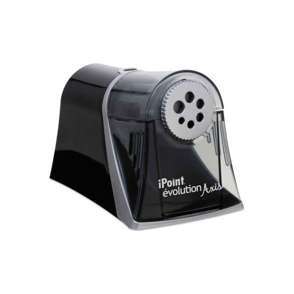 Westcott ipoint evolution axis pencil sharpener, ac-powered, 5" x 7.5" x 7.25", black/silver designed for high volume use in the office or school. Multi-hole dial accommodates all popular pencil sizes. Super quiet with the lowest noise rating in the industry. Super-fast sharpening using helical 10-blade technology. Sharp sense technology allows you to feel when the pencil is at the perfect point. auto shut off when pencil is completely sharpened. Safety cut off if the shavings reservoir is removed. Large ez view shavings reservoir that once removed, safely deactivates the sharpener.
