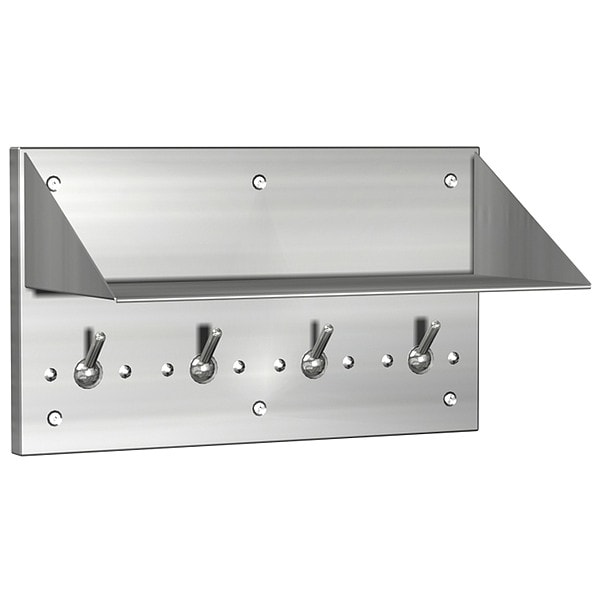 Bookshelf, Product Type Bathroom Shelf with Hooks, Mounting Type Exposed, Overall Height 10 1/2 in, Overall Width 10 1/2 in, Overall Depth 8 3/4 in, Material Stainless Steel, Finish Satin, Weight Capacity 20 lb, Center to Center Hole Distance 7 3/4 in, ADA Compliant No, Includes Mounting Hardware Yes, Features Auto-Release Hooks, Includes Hook, Resistance Properties Vandal Resistant