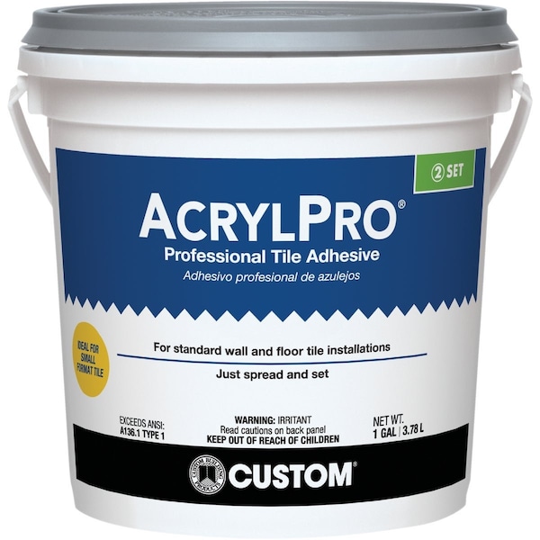 AcrylPro Ceramic Tile Adhesive is a professional formula adhesive with high bond strengths. Multi-purpose white nonstaining high performance mastic is ideal for small format ceramic marble mosaic porcelain quarry tile slate and natural stone on walls or floors. Recommended for tile up to 8 In. on any side. Recommended for interior use only. May be used in areas with intermittent water exposure such as tub surrounds and shower walls. Do not use for steam rooms shower floors or underwater. Not for use over radiant heat systems. Nonflammable. Coverage varies due to the substrate type of tile and size of notched trowel. On average 1 gallon covers 21 Sq. Ft. Installation dry time varies depending on the tile size and density substrate porosity and ambient conditions. Minimum dry time for 8 In. x 8 In. tile is 24-72 hours before applying grout.
