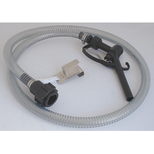 Discharge Hose Kit, Hose Length 8 ft, Hose Inside Dia. 1 in, Hose Cover Material PVC, Hose Tube Material PVC, Hose Fitting A Material Polypropylene, Hose Fitting B Material Polypropylene, Hose Fitting A Type FNPT, Hose Fitting B Type M Camlock, Hose Fitting A Size 1 in, Hose Fitting B Size 1 in, Wetted Materials PVC, Polypropylene, Viton, Includes Nozzle Yes, Nozzle Operation Manual, Nozzle Material Polypropylene, Includes Spout Yes, Spout Connection Type FNPT, Spout Discharge Size 1 1/8 in