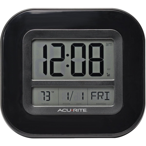 LCD wall clock with large LCD display showing the day date month and indoor temperature. Also displays seconds and time zone. 7 time zones to select from. Tabletop or wall display options. Dimensions: 8 H. x 9 W. x 1 D. 2 AA batteries (batteries not included).