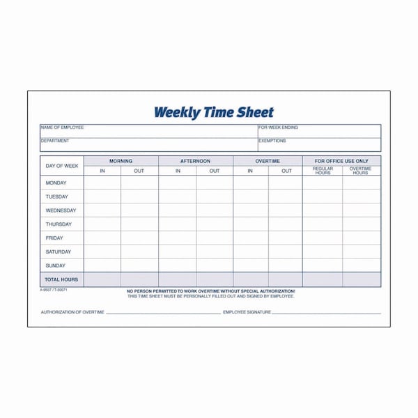 Weekly Time Sheets, One Part No Copies, 8.5 x 5.5, 100 Forms/Pad, 2PK