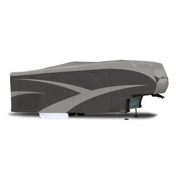 For Fifth Wheel Trailer; Fits 37 Foot 1 Inch To 40 Foot Length; 486 Inch Length x 108 Inch Width x 126 Inch Height; Moderate Weather Protection; Breathable/ Water Resistant/ Resists To High Humidity And Rainfall With UV Protection; Two-Tone Gray; 3 Layer Fabric Top/3 Layer Polypropylene Sides; With Zipper Entry Panels/ Quick Connect Buckles/ Reinforced Elasticized Bottom Corners/ Front And Rear Cinching; Vented