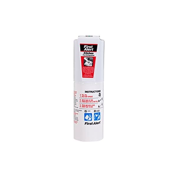 Kitchen Fire Extinguisher Push Button Pressure Check UL Rated 5-B:C Sodium Bicarbonate Extinguishing Agent Quick Release Mounting Cap For Easy Access 10 Year Limited Warranty.