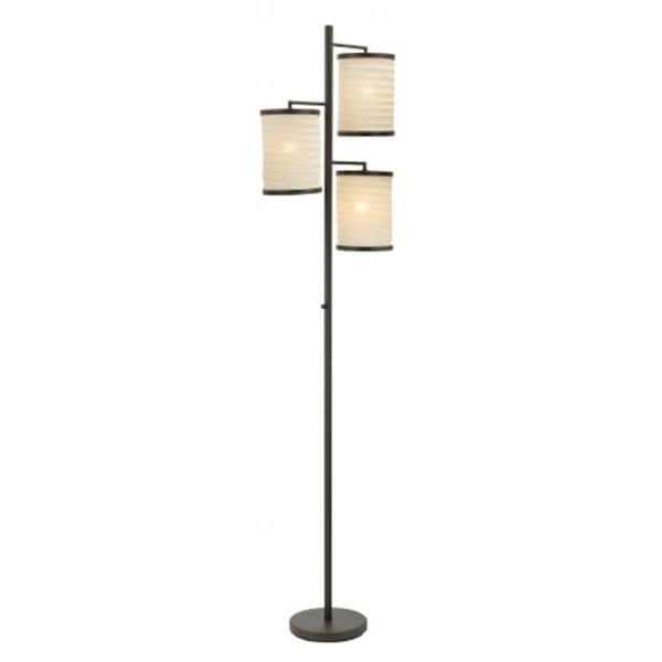 The three ";lanterns"; have metal ribbed, white cotton fabric suspended shades. The 74"; high base is an antique bronze T-stand, with a rectangular base. A three way turn switch is located on the pole.