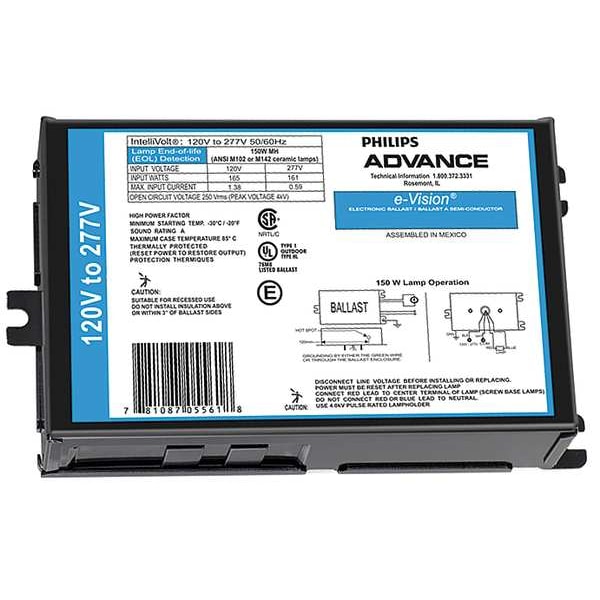 e-Vision(TM), Electronic, HID Ballast, Ballast Start Type Pulse, ANSI Code C102, C142, M102, M142, Metal Halide Ballast Bulb Type, Number of Bulbs Supported 1, Max. Bulb Watts 150 W, Input Voltage 120/277V AC, Input Watts 161W, -4 Degrees F Min. Starting Temp., Ballast Factor 1, Frequency 50/60 Hz