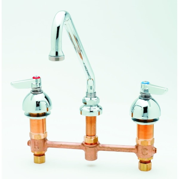 Faucet, 3 hole deck mounted, 8 in. OC, 9 in. swing spout, chrome plated wedge handles with hot & cold indexes, brass chrome plated body & spout, lead free