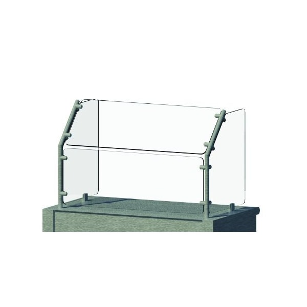 Food shield, cafeteria style, 45 deg. angled front, fixed front glass, 48 in. long, 23-3/8 in. tall, 1/4 in. thick heat tempered glass front & side panels side panels 18 in. deep to meet NSF requirements, 1 in. stainless steel tubing with end caps Note: food shields are also known as sneeze guards or breath shields