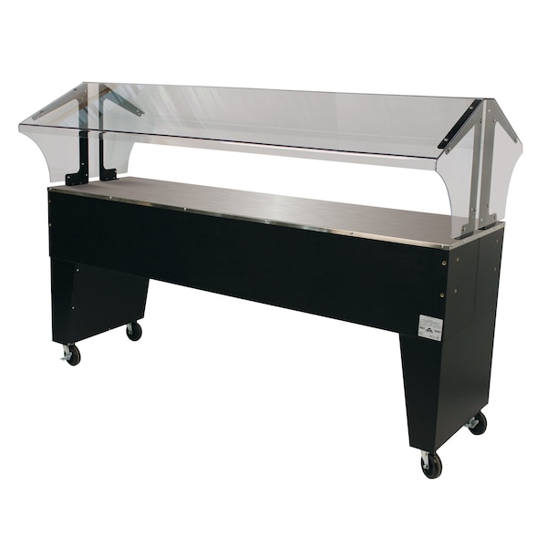 Portable Solid Top Buffet Table, 77-3/4 in.W x 35 in.D x 53 in.H, 5 pan size, 20 gauge stainless steel solid top, double sided sneeze guard, black vinyl clad open base, 4 in. swivel casters 2 braked, NSF