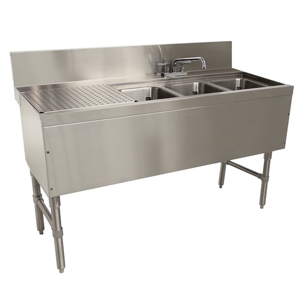 Prestige Underbar Sink Unit, 3-compartment, 60 in.W x 25 in.D x 36 in.H, 14 in. front-to-back x 10 in. left-to-right x 10 in. deep sink bowls, 23 in. drainboard on left, 7 in.H backsplash, stainless steel open frame base, side crossrails, stainless steel construction, includes: 1 deck mount faucet with 12 in. swing spout, NSF