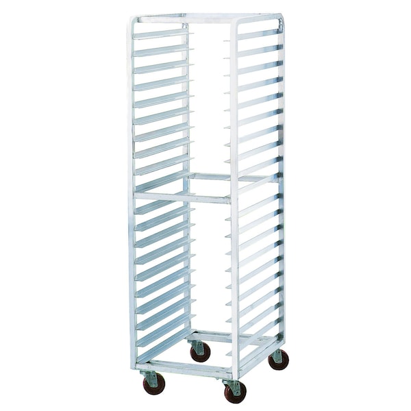 Roll In Oven Rack, 20 18 in. x 26 in. pan capacity, 3 in. shelf spacing, 1-1/2 in. ribbed angles, front load, welded aluminum construction, 1 in. square tubing, curved top, 4 in. oven plate casters, overall; 20-3/8 in. x 26 in. x 68-5/8 in., NSF