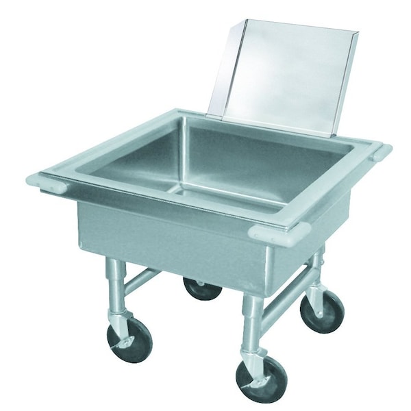 Soak Sink, portable, 20 in. working height, sink outlet fitted with quick-release drain, 22 in. x 22 in. x 8 in. deep fabricated sink compartment, stainless steel construction, silver chute, casters, accommodates 19-3/4 in. x 19-3/4 in. dishwasher baskets by others