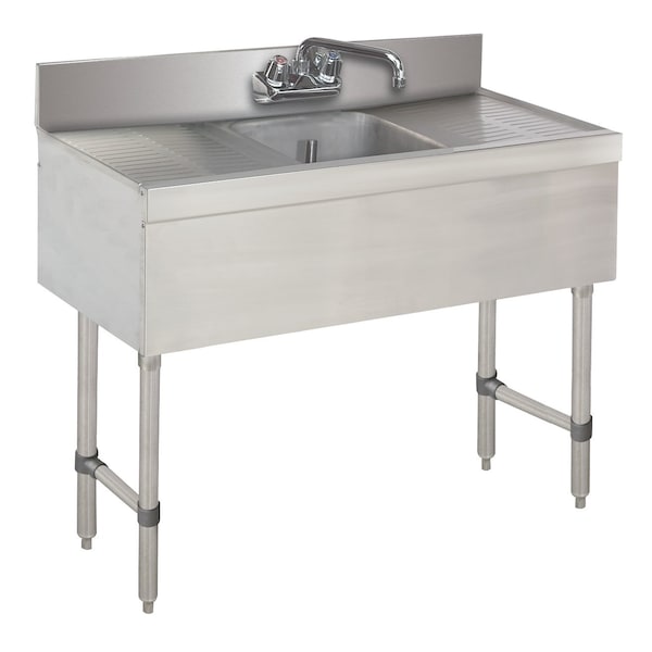 Special Value Sink Unit, 1-compartment, 36 in.W x 18 in.D x 33 in.H overall, 4 in.H backsplash, 1 10 in.W x 14 in.D x 10 in. deep sink bowl with 1 splash mounted faucet with 6 in. spout, 12 in. drainboards on left & right, stainless steel construction with galvanneal understructure, galvanized legs with front-to-back cross rails & adjustable bullet feet, NSF
