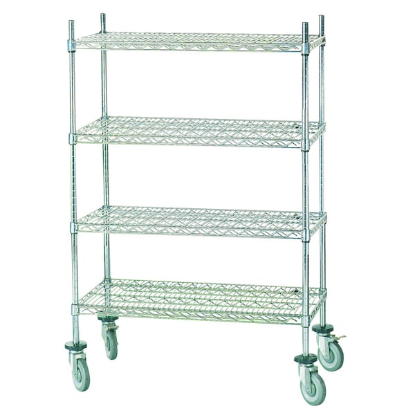 Stem Caster Cart, 24 in. wide, 36 in. long, 4 wire chrome finish shelves, 4 64 in. chrome finish posts, 4 swivel poly casters with donut bumpers 2 with brakes