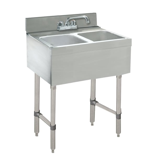 Underbar Basics Sink Unit, 2-compartment, 24 in.W x 21 in.D x 33 in.H overall, 4 in.H backsplash, 2 10 in.W x 14 in.D x 10 in. deep sink bowls with overflow pipe, 1 deck mounted faucet with 6 in. spout, no drainboards, stainless steel construction with galvanneal understructure, galvanized legs with front-to-back cross rails & adjustable bullet feet, NSF