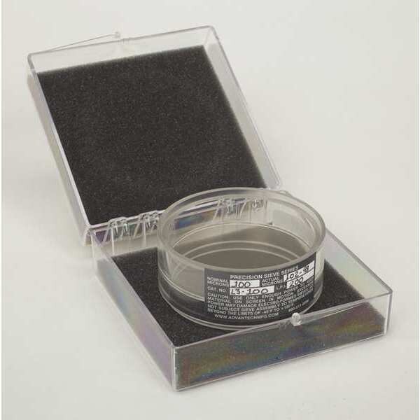 Ultrasonic Test Sieve, Clear Acrylic Frame, Nickel Screen Material, Acrylic Frame Material, Mesh Size Fine, Mesh Size Range Fine, Opening Size 95 micron, Outside Dia. 3.5 in, Frame Inside Dia. 3 in, Overall Depth 3.25 in, ASTM E161 Standards