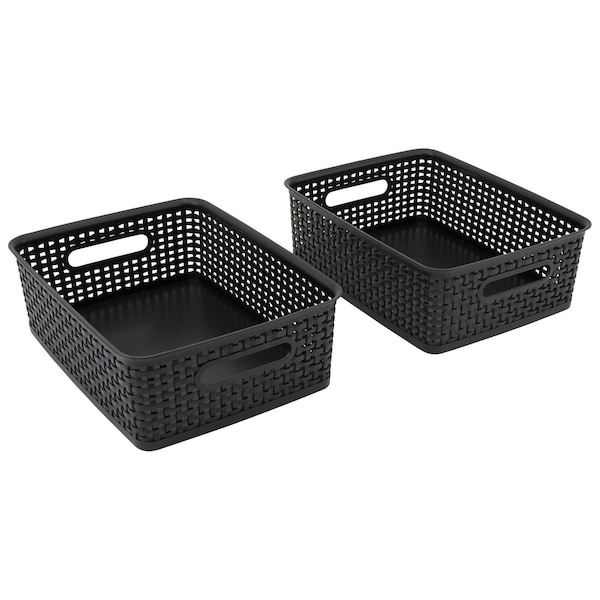 Function and fashion come together in these plastic weave bins to declutter any home or office environment. These medium sized bins are perfect for a variety of items such as papers, folders, and more. Made with a sturdy black plastic, these bins can serve a multitude of functions. Each bin measures 10.25in.L x 14.25in.W x 4.75in.H.