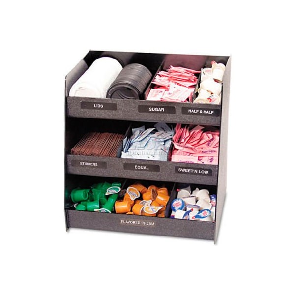 vertical condiment organizer, 14-1/2w x 11-3/4d x 15h, black vertical condiment organizer commercial-grade construction will not crack, fade or chip compartment identifier decal strips included with keys a-f three shelves with nine compartments to serve larger areas. Includes six removable dividers. 14-1/2w x 11-3/4d x 15h. Shpg. Wt. 7 lbs. Black this product arrives to most customers in 2-3 business days.