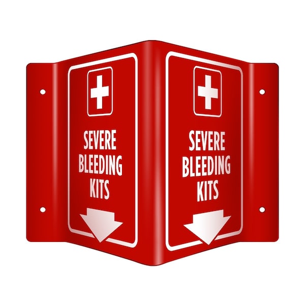 This red 3D sign is viewable from multiple angles down a corridor Says Severe Bleeding Kits with downward pointing arrow