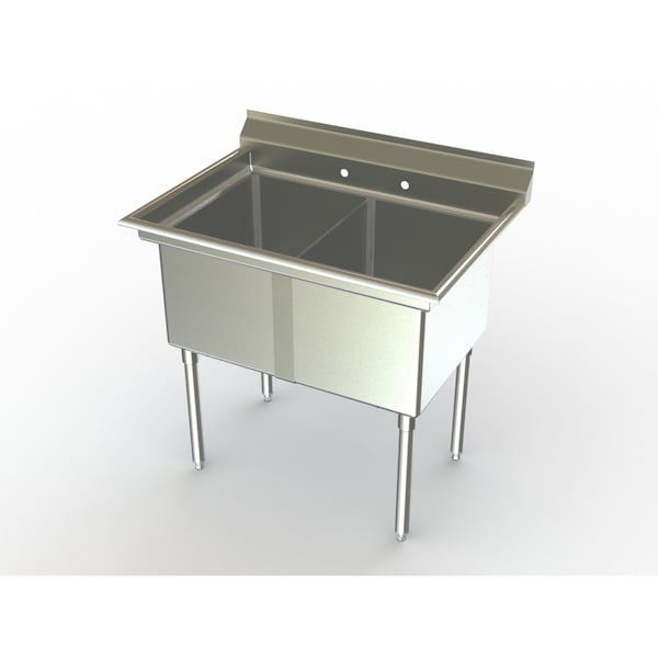 Deluxe Sink, 2-bowl, no drainboard, 21" W x 16" L-R bowl dimensions, 14" D fabricated bowl, 7" H splash, s/s gussets, legs & adjustable white metal feet, 16 gauge 300 series s/s, "Aero Safety Edge", Space Saver const, fully welded gussets, shipped KD, NSF
