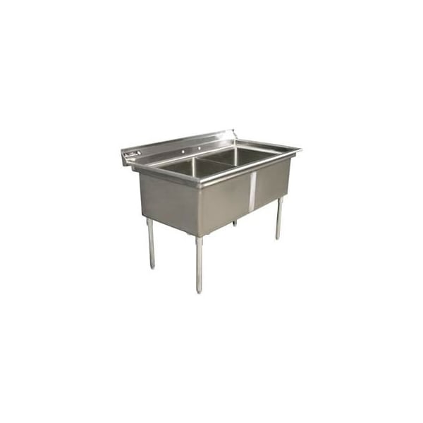 2 compartment stainless steel sink constructed of durable 16 gauge stainless steel with hemmed edges for safety. Compartment sinks are 430 stainless steel, best suited for soap and water applications. All sinks have an 8"h backsplash, 1-1/2" diameter 304 stainless steel legs with adjustable levelers. Faucet spacing on 8" centers (4" on hand sinks) 1/2" hot and cold water supply. 41" overall height.