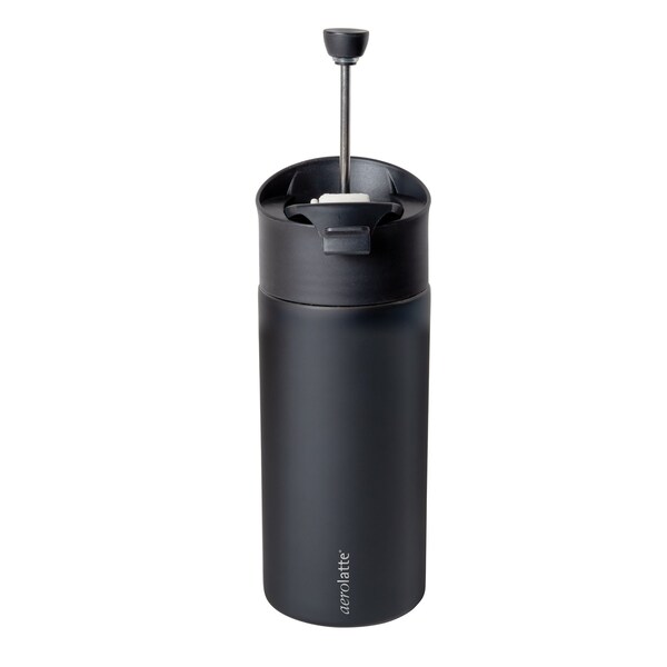 Aerolatte's French Press To Go is a unique travel mug with a built-in French press to brew a fresh-pressed cup any time, anywhere Made from 18/8 stainless steel and BPA-free polypropylene; measures 2.75 x 7.5-inches|Double-walled design keeps drinks hot or cold for up to 12 hours; locking sip-through lid is leakproof, even upside down Smooth-action plunger presses grounds and sediment to the bottom for a clean brew; ideal for on-the-go coffee enthusiasts Simply measure in coffee, add hot water, press, and go; compact for easy travel; dishwasher safe for easy cleanup
