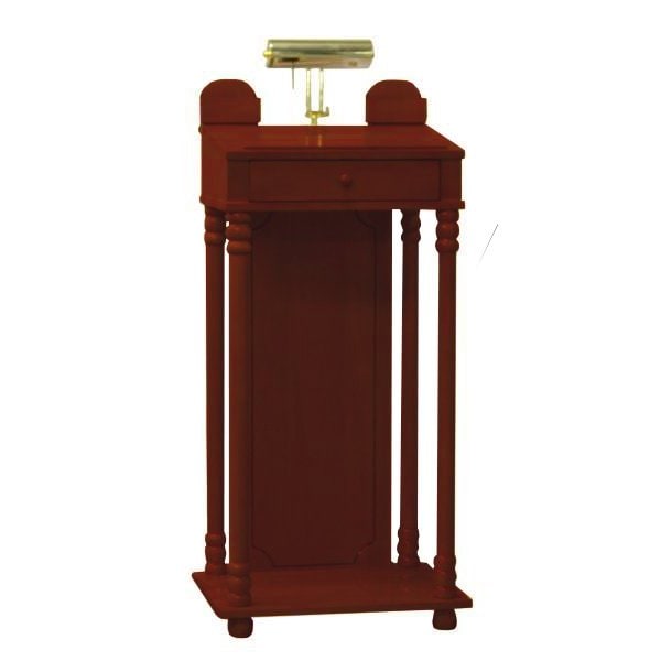 Premium Lectern Can be turned around and used as a speaking podium as well (electrical cord can be concealed on either side of unit) Pull out drawer for storage of books, cards, etc... 2 cardholders for memorial cards on top Dimensions: Height to where book sits: 44" Height to top of light: 54" Width: 22" Depth: 16"