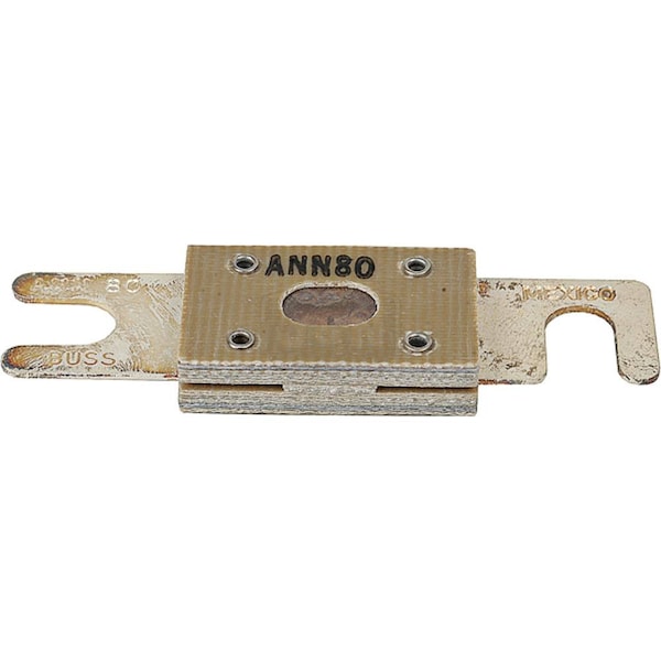 One New Aftermarket Tech Info:-Arrowhead: ANN80; Cooper Bussmann: ANL80, ANN80; JAndN Electrical Products: 250-01006; Littelfuse: 0CNN080V; Vanner: 03638-VOLTAGE RATING: 10-125, AMPS: 80, SERIES: ANN, PACKAGING: Box, : Glass-laminated Melamine Body@ 7/8 by 3 3/16Replaces Part Numbers: CBF-ANN80