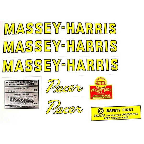 One New Aftermarket MH Pacer Mylar Decal SetFits Massey Harris Models Pacer 16Tech InfoCaution Inspect all decal pieces before applying to the tractor We cannot offer a refund on mylar decals if they have been applied andor if they are damaged Store these tractor decals in a cool, dry place Do not soak these mylar tractor decals in water Detailed application instructions are included with each decal set Please follow the appropriate instructions for your tractor decal set