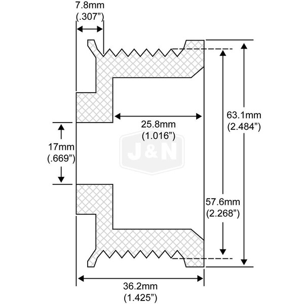 One New Aftermarket Tech Info:-Arrowhead: AND5040, ND021041-8040; Fits Denso: 021041-8040; JAndN Electrical Products: 207-52002-CENTER OF GROOVE TO REAR: 0.307, CENTER OF GROOVE TO REAR: 7.800mm, GROOVE OD: 2.268, GROOVE OD: 57.600mm, GROOVE TYPE: Serpentine, ID: 0.669, ID: 17 mm, NUMBER OF GROOVES: 7, NUT RECESS: 1.016, NUT RECESS: 25.800mm, OD: 2.484, OD: 63.100 mm, PULLEY TYPE: Solid, THICKNESS: 34.400 mmReplaces Part Numbers: 207-52002